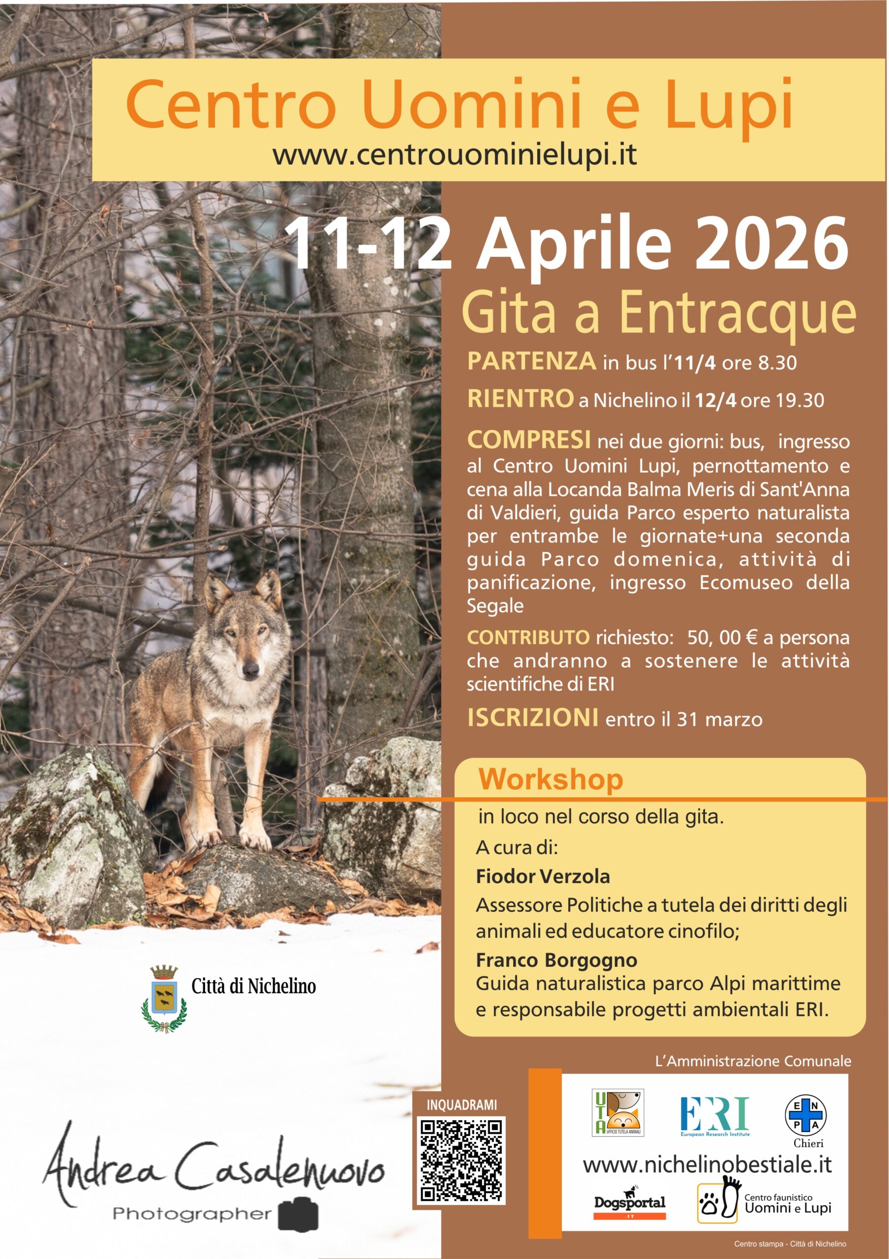 Sabato 11/04/26: partenza in bus ore 8.30 da Informagiovani Nichelino, arrivo alle ore 10.30 al centro faunistico Uomini e Lupi di Entracque (località Casermette), pranzo al sacco ore 12.30 circa negli spazi del Centro Visita alla Centrale ENEL. Nel pomeriggio si intraprenderà un percorso di scoperta dedicato al mito e alla biologia del lupo presso il Centro Visita di Entracque. Cena e pernottamento presso la Locanda Balma Meris a sant’Anna di Valdieri.