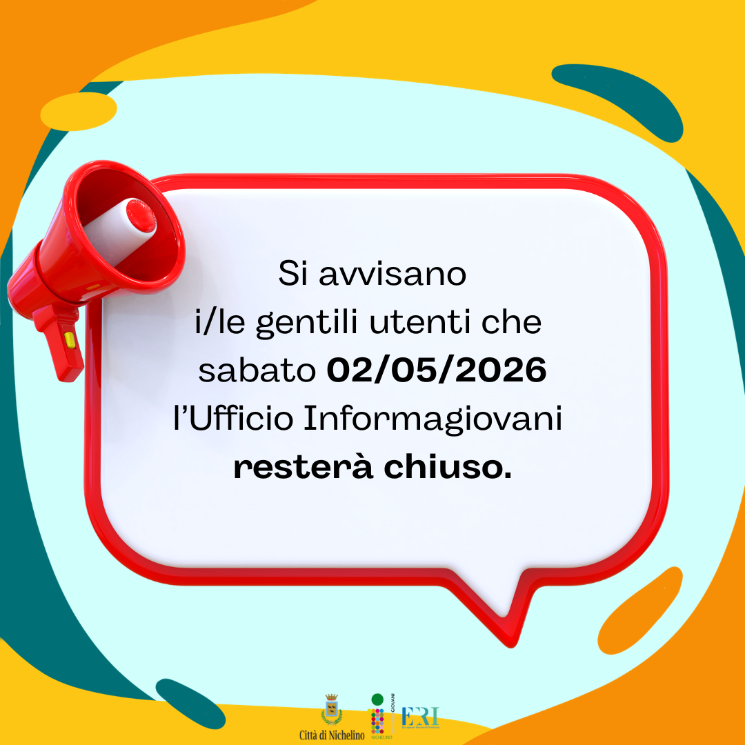 Si avvisano i/le gentili utenti che sabato 02/05/2026 l’Ufficio Informagiovani resterà chiuso.